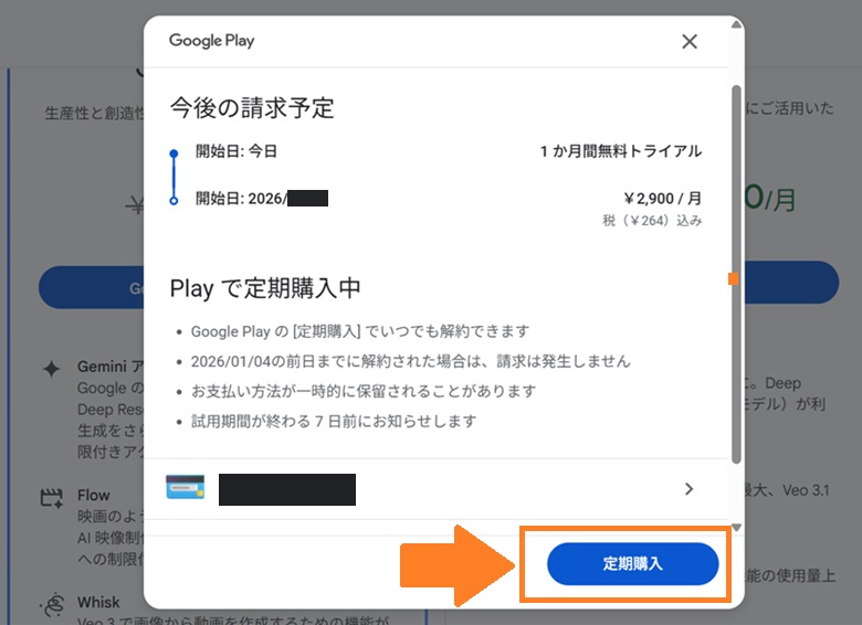 「定期購入しました」と表記されますが、Google AI Proの場合は1か月は無料トライアルで試せます。月額料金が発生するのは、満1か月が経過した次の日からです。
