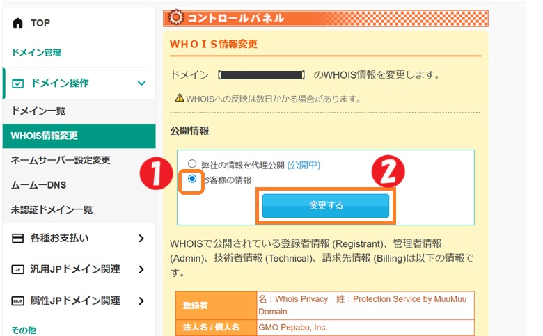 コントロールパネルに切り替わったら、「WHOIS情報変更」をクリックします。