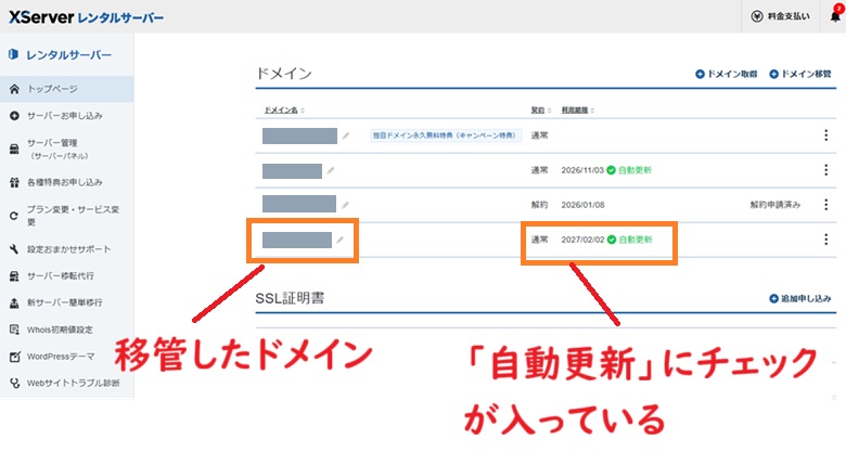 エックスサーバーアカウントにログインし、移管したドメインを確認。「自動更新」にチェックが入っているかも点検します。