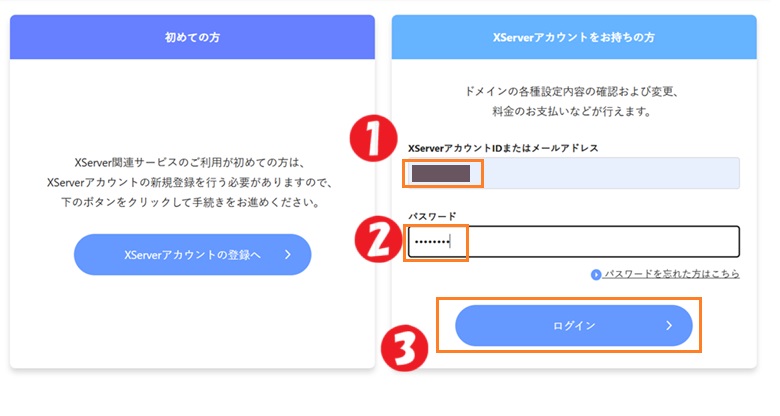 すでにエックスサーバーのアカウントを持っている場合は、「XserverアカウントID」または「メールアドレス」、「」を入力し、ログインを押します。